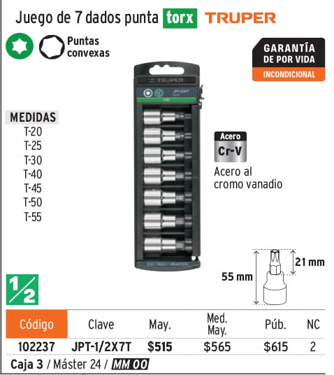 Dado largo de 22 mm, 6 puntas, cuadro 1/2", TRUPER