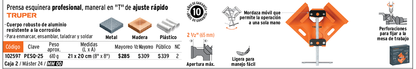 Prensa esquinera profesional, 2-1/2" de aluminio, TRUPER