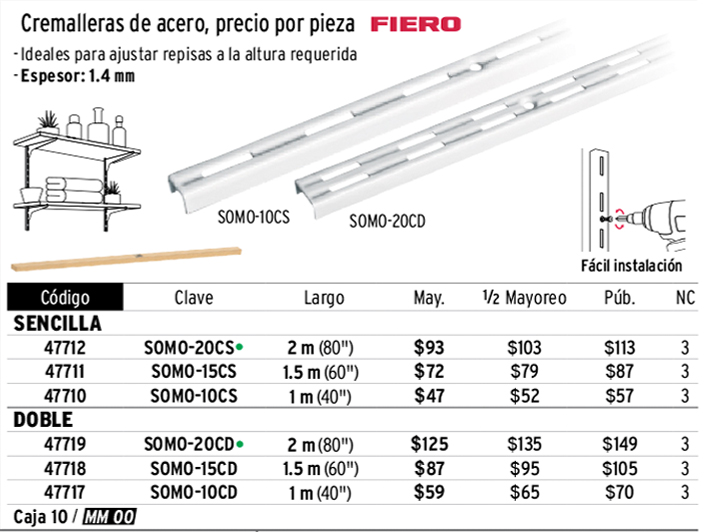 Cremallera doble blanca para ménsulas planas, 1m, FIERO