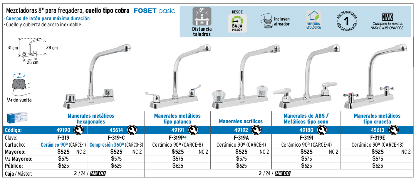Mezcladora 8" fregadero cromo, cuello cobra,hexagonal, BASIC
