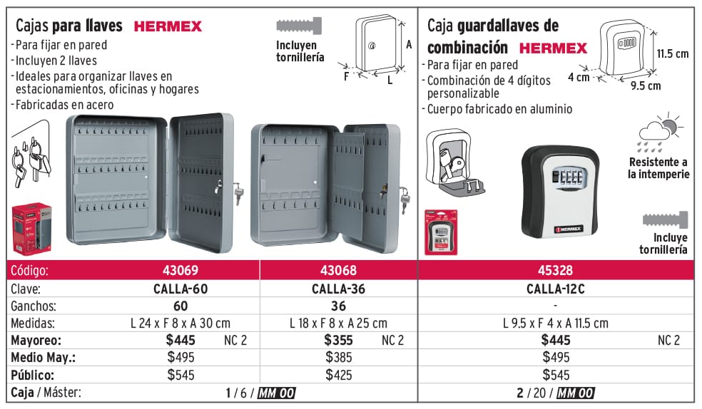 Caja de combinación guardallaves para pared, 12cm, HERMEX