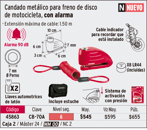 Candado para disco de motocicleta, perno de 7 mm, c/alarma