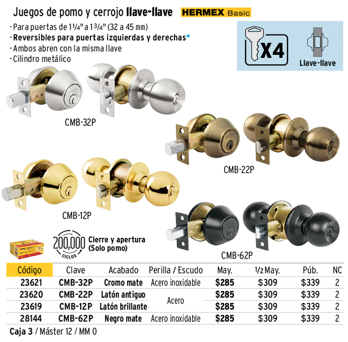 Combo cerraduras, llave-llave, latón brillante, HERMEX BASIC