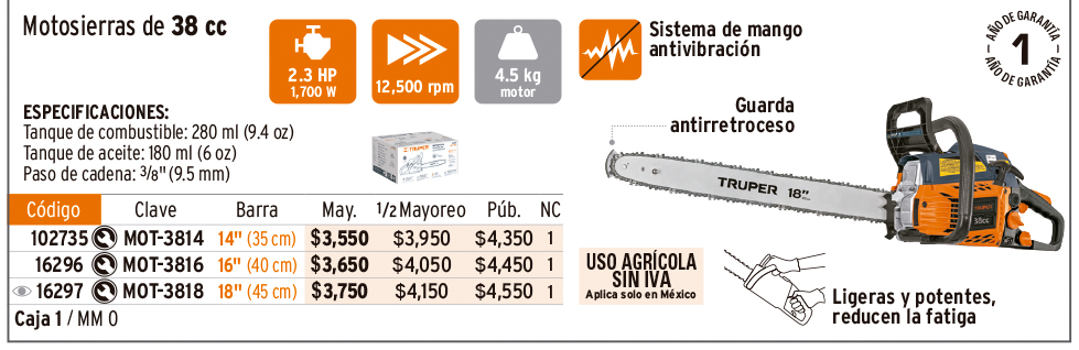 Motosierra 38 cc a gasolina con barra de 18", TRUPER