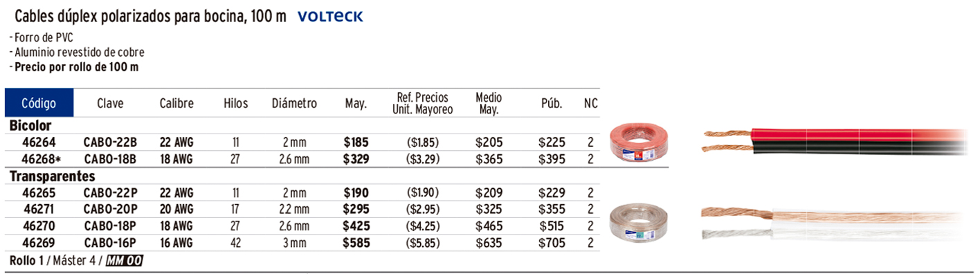 Rollo de 100 m de cable polarizado bicolor p/bocina 18 AWG