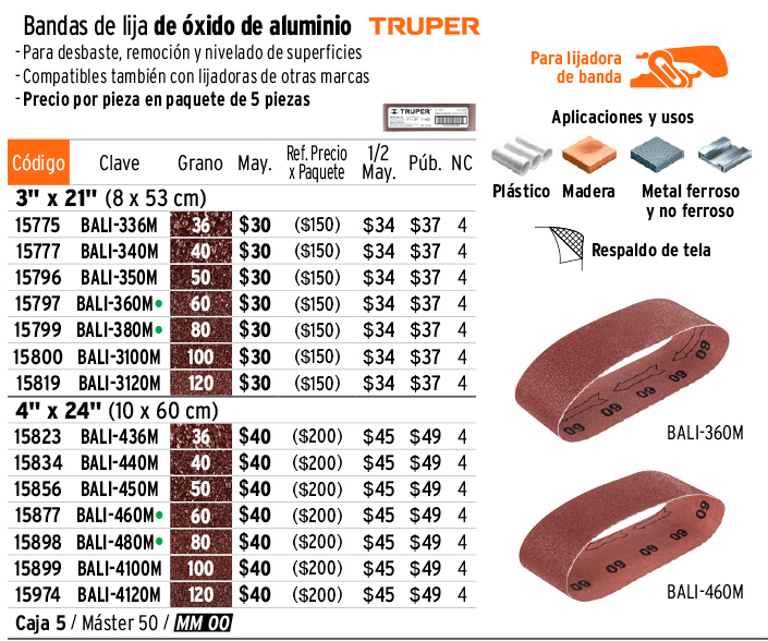 1 banda de lija 3 x 21" óxido de aluminio grano 100, 5 pzs