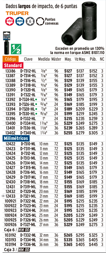 Dado largo impacto de 36 mm, 6 puntas, cuadro 1/2", TRUPER