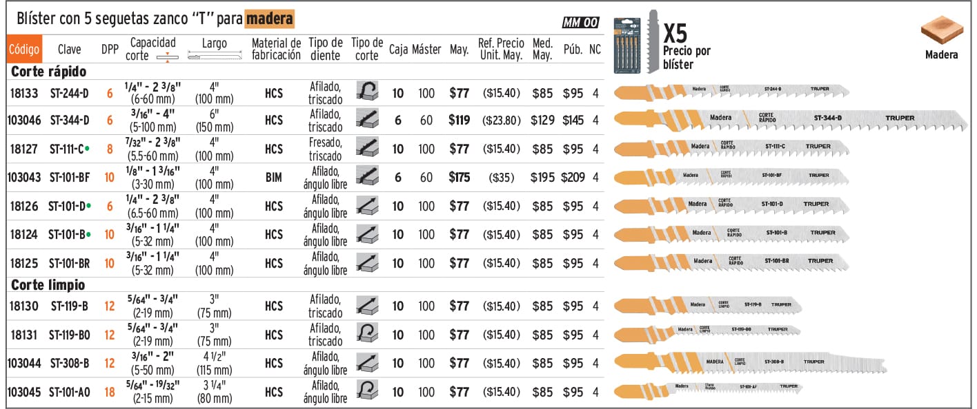Blíster 5 seguetas T, 10 DPP BIM, corte recto p/ madera dura
