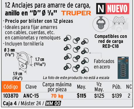 12 anclajes para amarre de carga, anillo en "D" espesor 1/8"