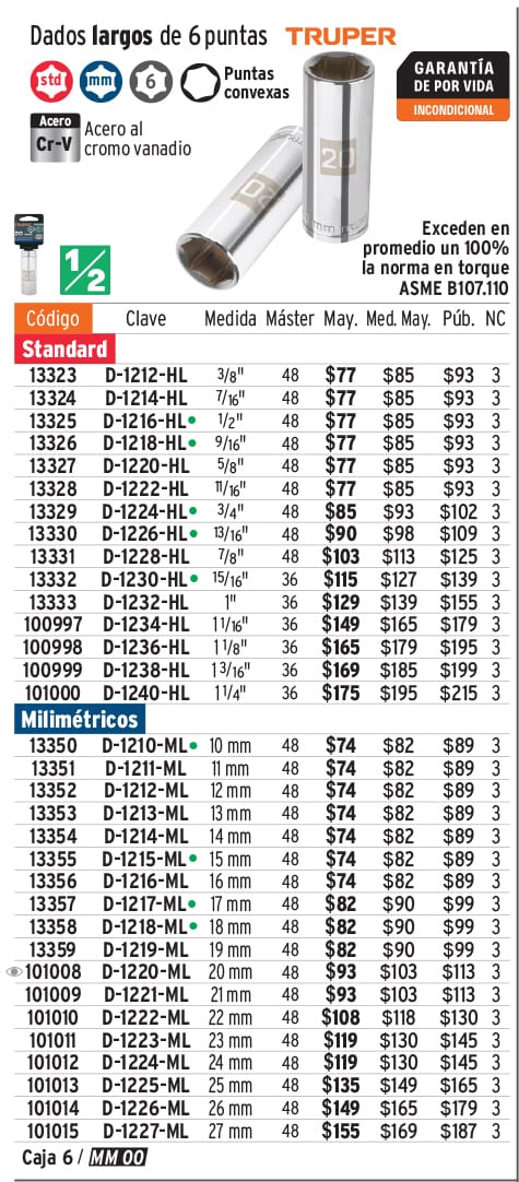 Dado largo de 26 mm, 6 puntas, cuadro 1/2", TRUPER