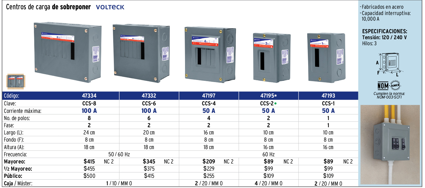 Centro de carga metálico 6 polos 100A de sobreponer, VOLTECK