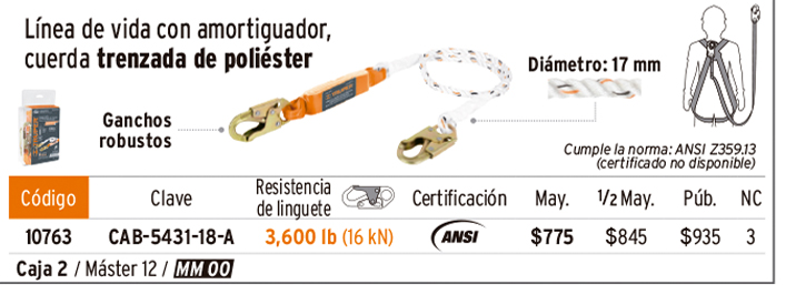 Línea de vida 1.8m cuerda poliéster, absorbedor impacto,ANSI