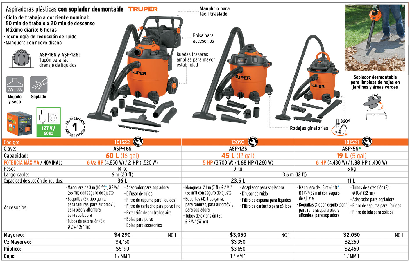 Aspiradora sólidos y líquidos, 12 gal, soplador desmontable
