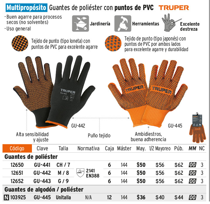 Guantes de poliéster con puntos de PVC en palma, CH, TRUPER