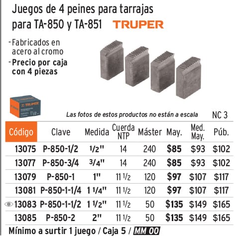 Juego de 4 peines 3/4" para tarrajas TA-850 y TA-851, TRUPER