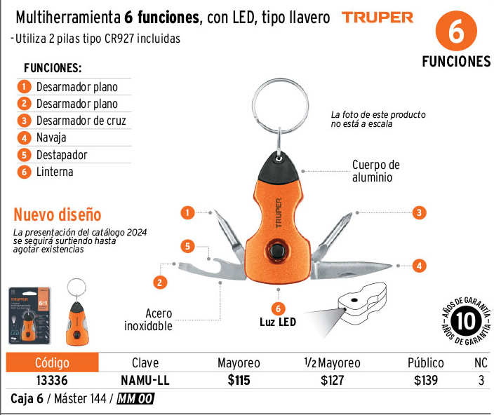 Multiherramienta 6 funciones, con LED, tipo llavero, TRUPER