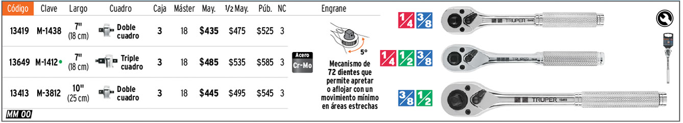 Matraca triple cuadros 1/4", 3/8" y 1/2", TRUPER