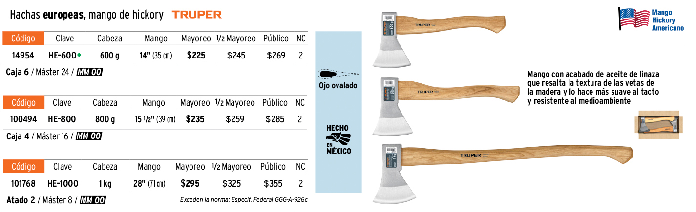 Hacha europea, 600 g, mango hickory 14", TRUPER