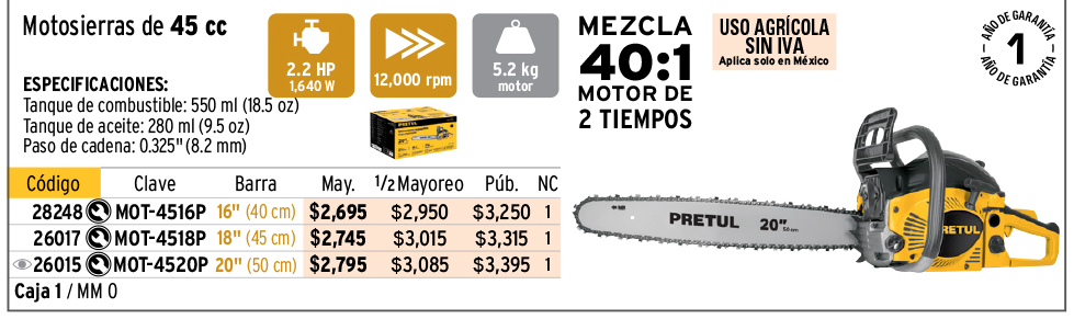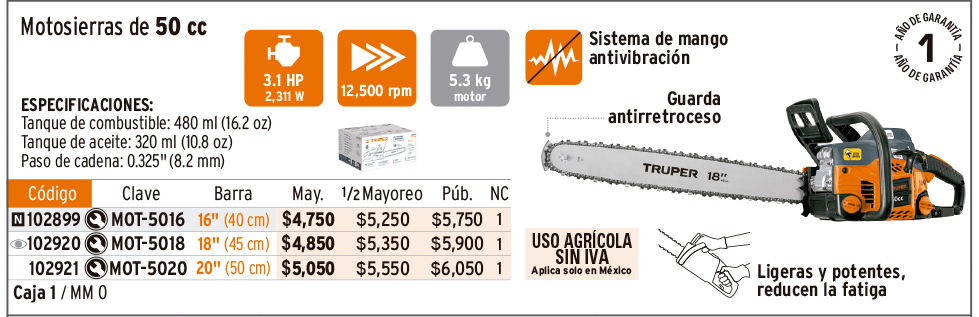 Motosierra 50 cc a gasolina con barra de 18", TRUPER