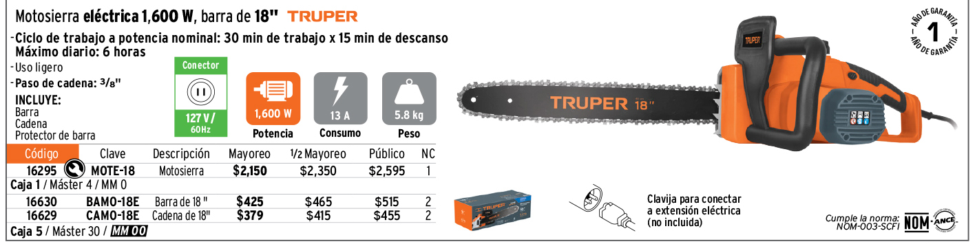 Motosierra eléctrica 1600 W con barra de 18", TRUPER