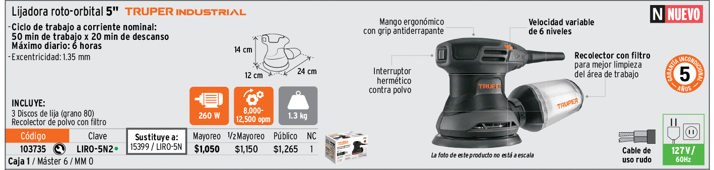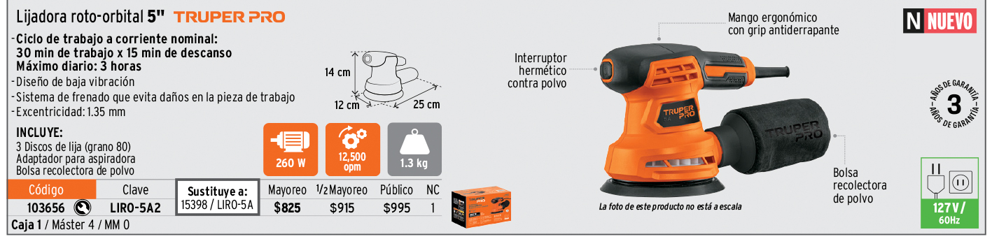 Lijadora roto orbital 5", 260W, TRUPER INDUSTRIAL