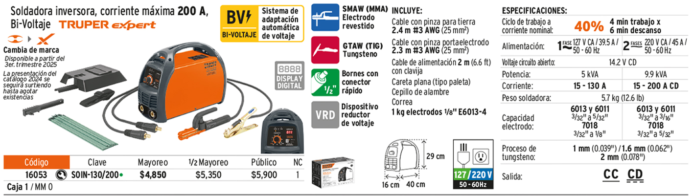Soldadora inversora 200A, bi-voltaje 127/220V, TRUPER EXPERT