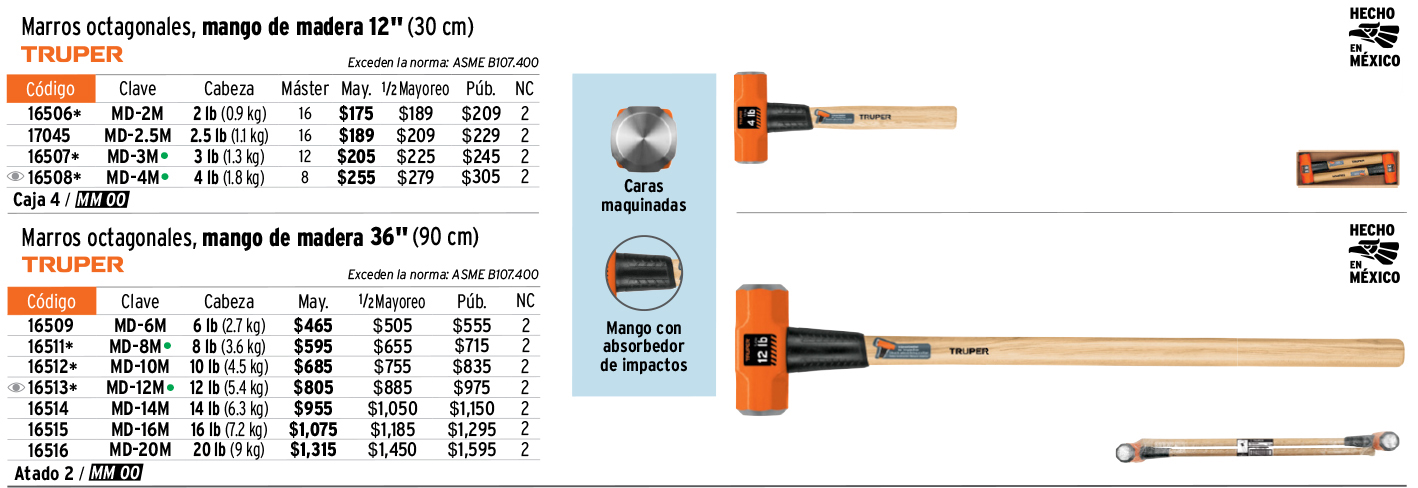 Marro octagonal 2 lb, mango de madera 12", TRUPER
