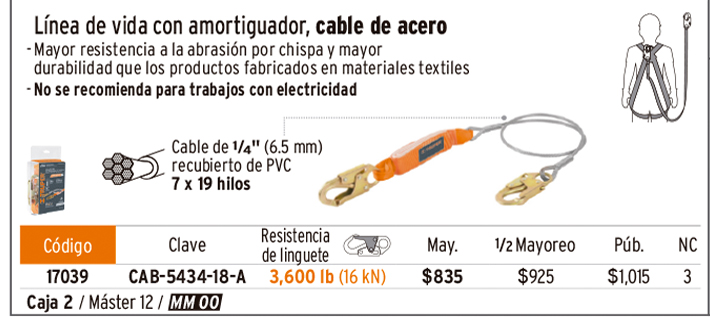 Línea de vida 1.8 m cable de acero, absorbedor impacto, ANSI