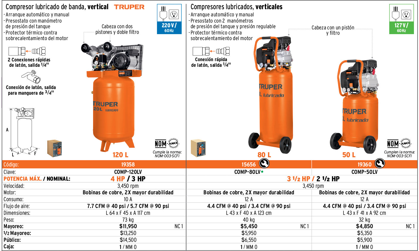 Compresor lubricado, de banda, 120L, 4HP, vert, 220V, TRUPER