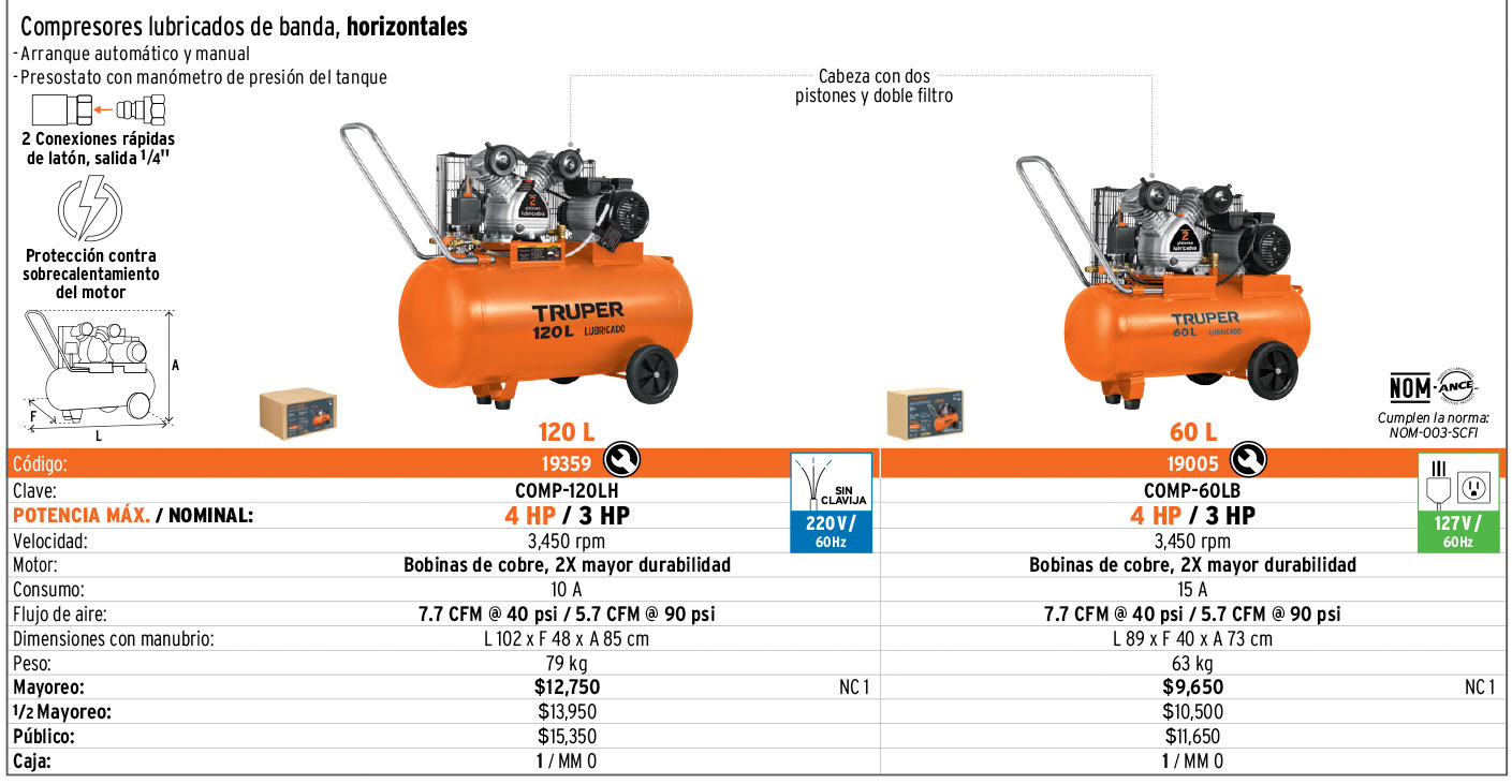 Compresor lubricado, de banda, 60L, hor, 4HP, 127V, TRUPER