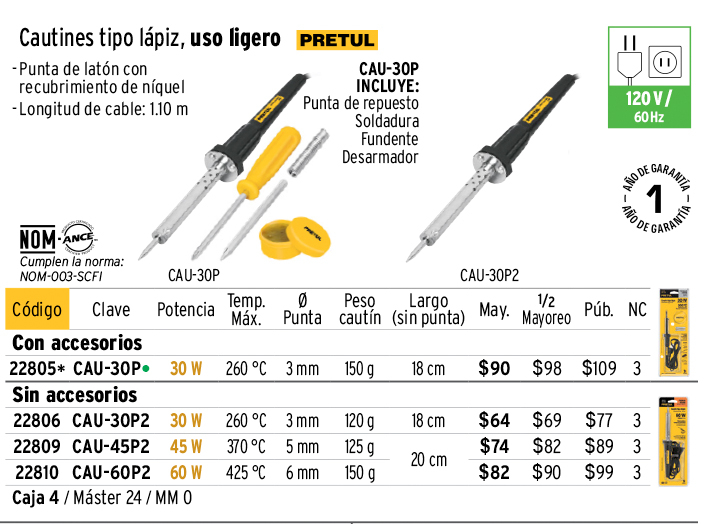 Cautín 60 W tipo lápiz para trabajo pesado, PRETUL