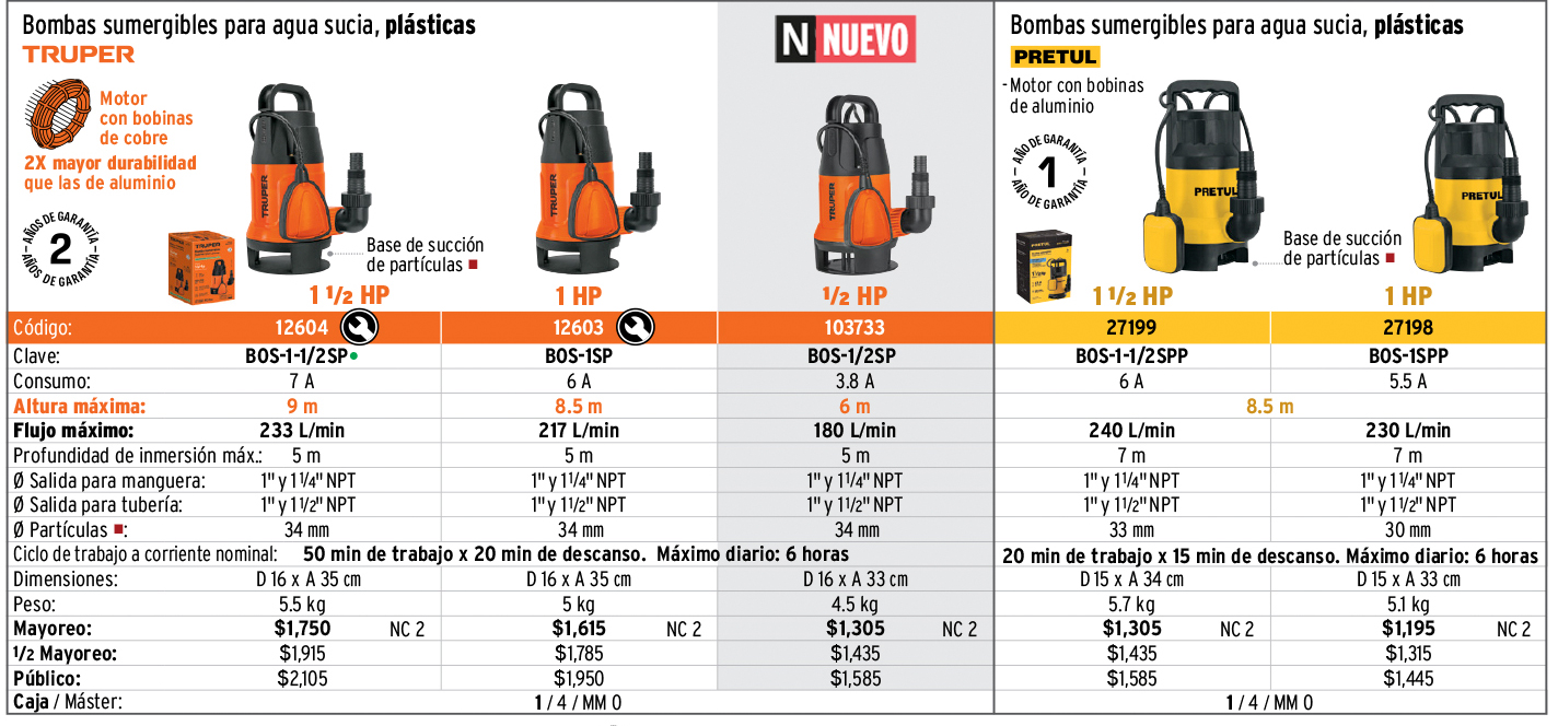 Bomba sumergible plástica, 1-1/2 HP para agua sucia, PRETUL