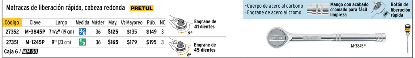 Matraca cuadro 3/8" liberación rápida cabeza redonda, PRETUL