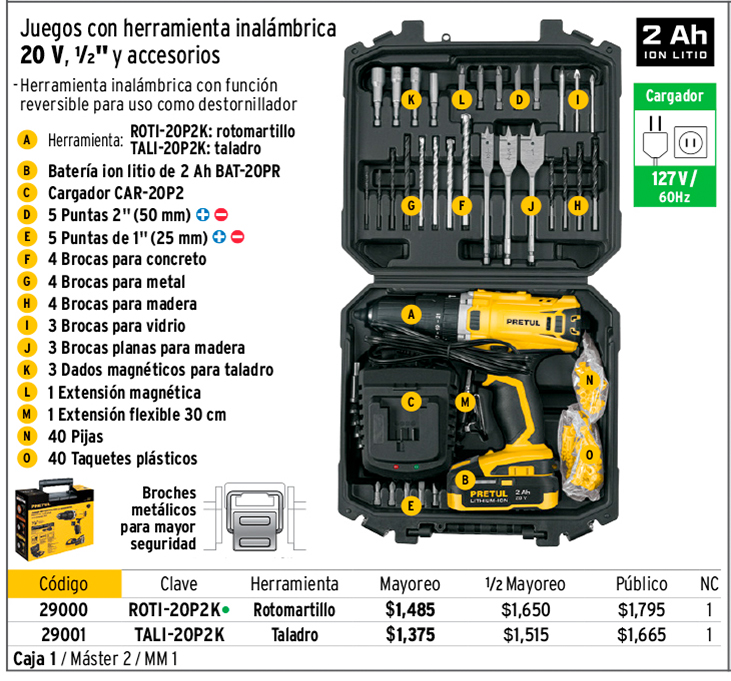 Kit rotomartillo/destornillador 1/2", 20V, 32 acc., PRETUL
