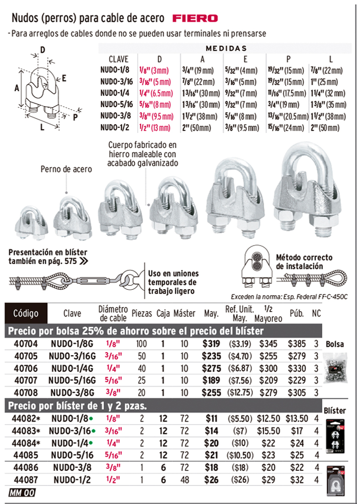 Blíster c/2 nudos (perros) de hierro p/cable de 1/4", FIERO