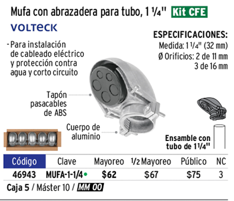 Mufa con abrazadera para tubo 1-1/4", VOLTECK