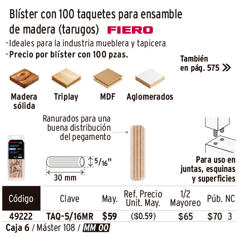 Blíster con 100 taquetes de madera ranurado 5/16", FIERO
