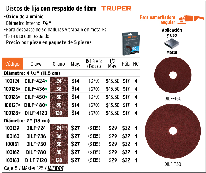 Disco de lija 4-1/2" con respaldo de fibra, grano 36, TRUPER