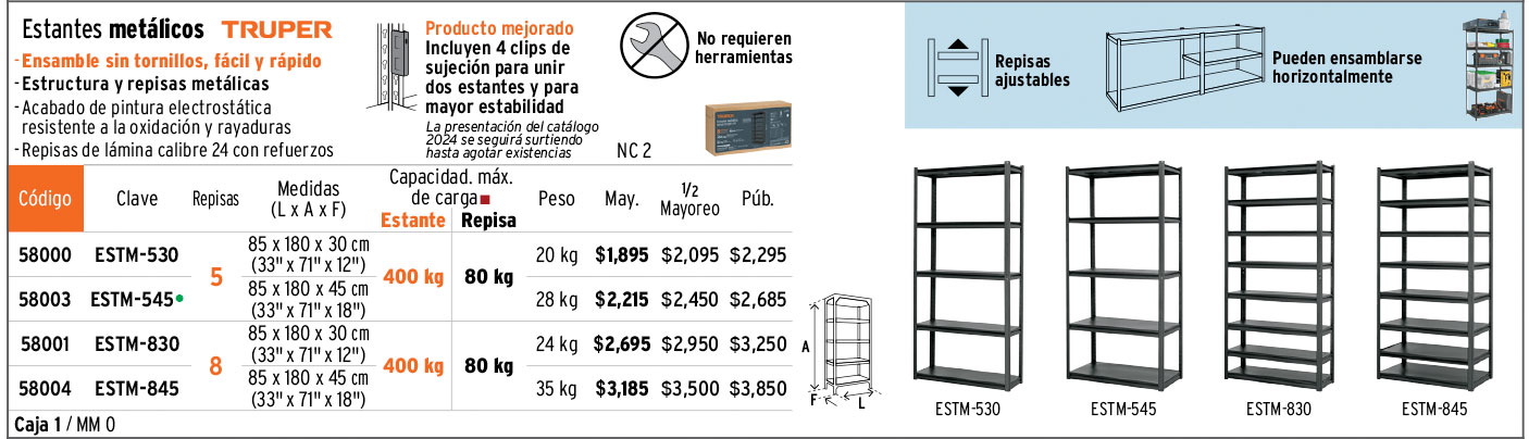 Estante metálico 8 repisas capacidad 80 Kg,180x45x85, TRUPER
