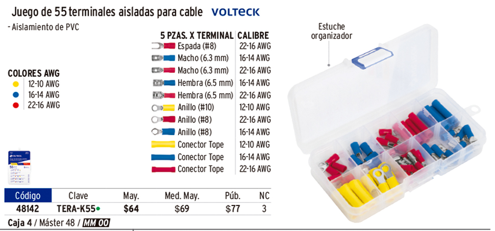 Juego de 55 terminales aisladas para cable, VOLTECK