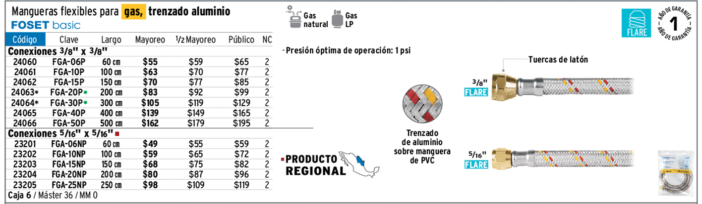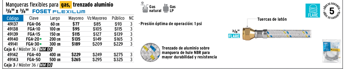 Manguera para gas, aluminio, 3/8" flare , 100 cm, FOSET