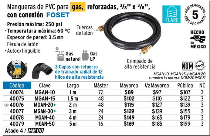 Manguera para gas, PVC negra, 3/8" flare, 2 m, FOSET