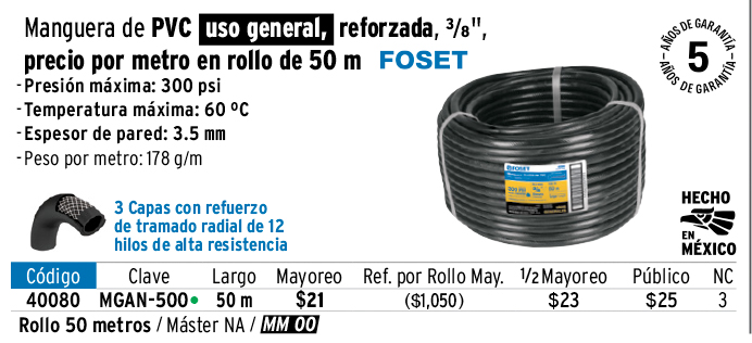Manguera para gas, PVC negra, 3/8" sin conexión, 50 m, FOSET