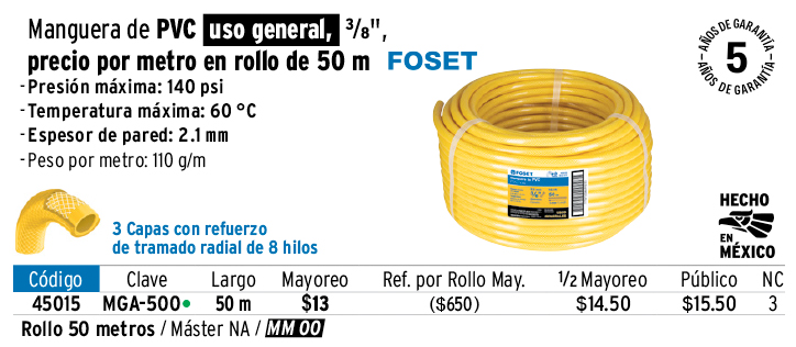 Manguera para gas, PVC amarilla, 3/8" s/conexión, 50 m,FOSET
