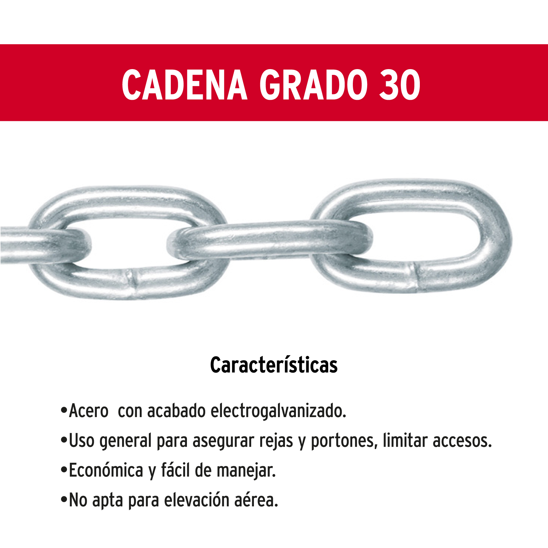 Cadena grado 30, formada en frío y fabricada en acero con acabado electrogalvanizado que da mayor resistencia a la corrosión