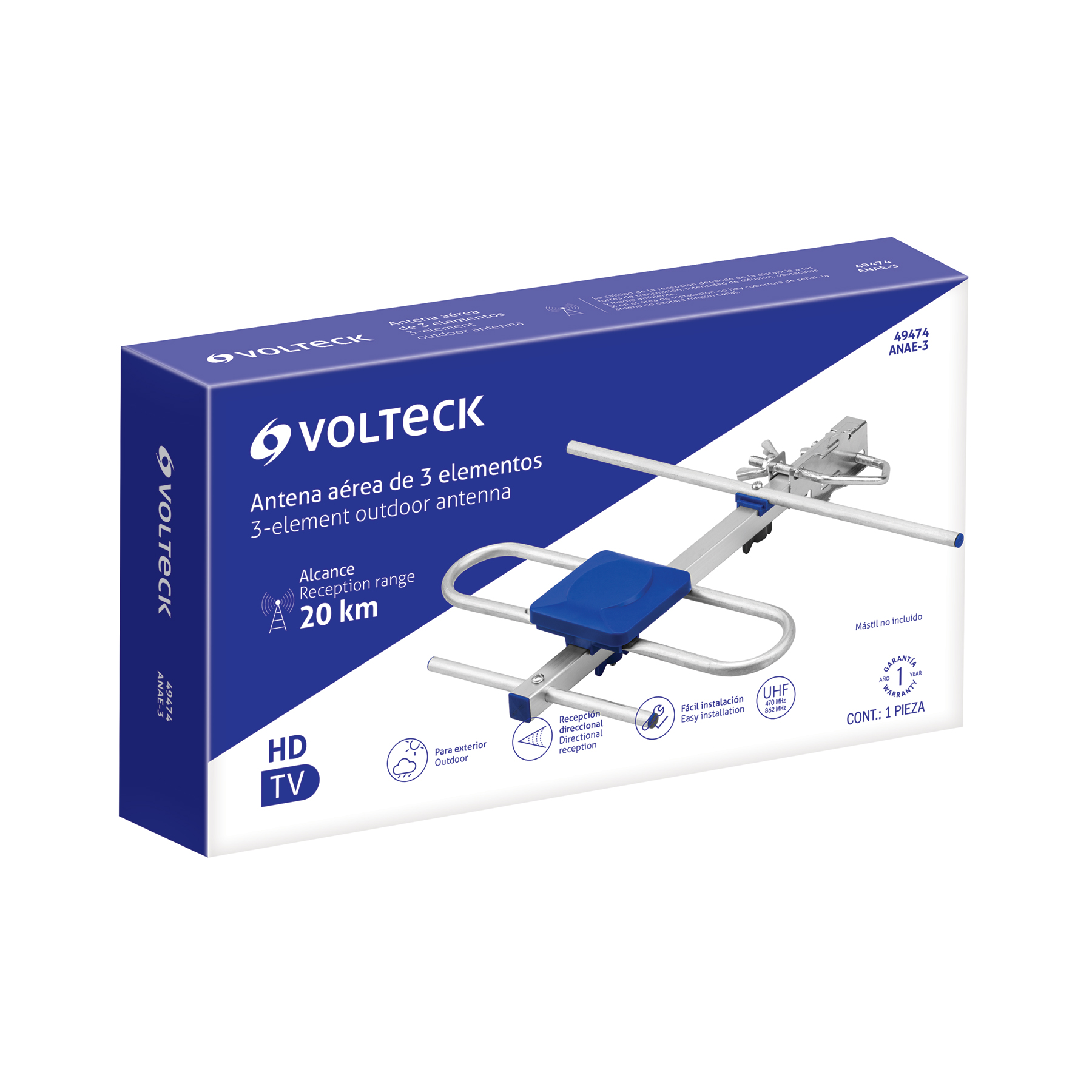 Antena aérea para HD TV, 3 elementos, 3 dB, VOLTECK