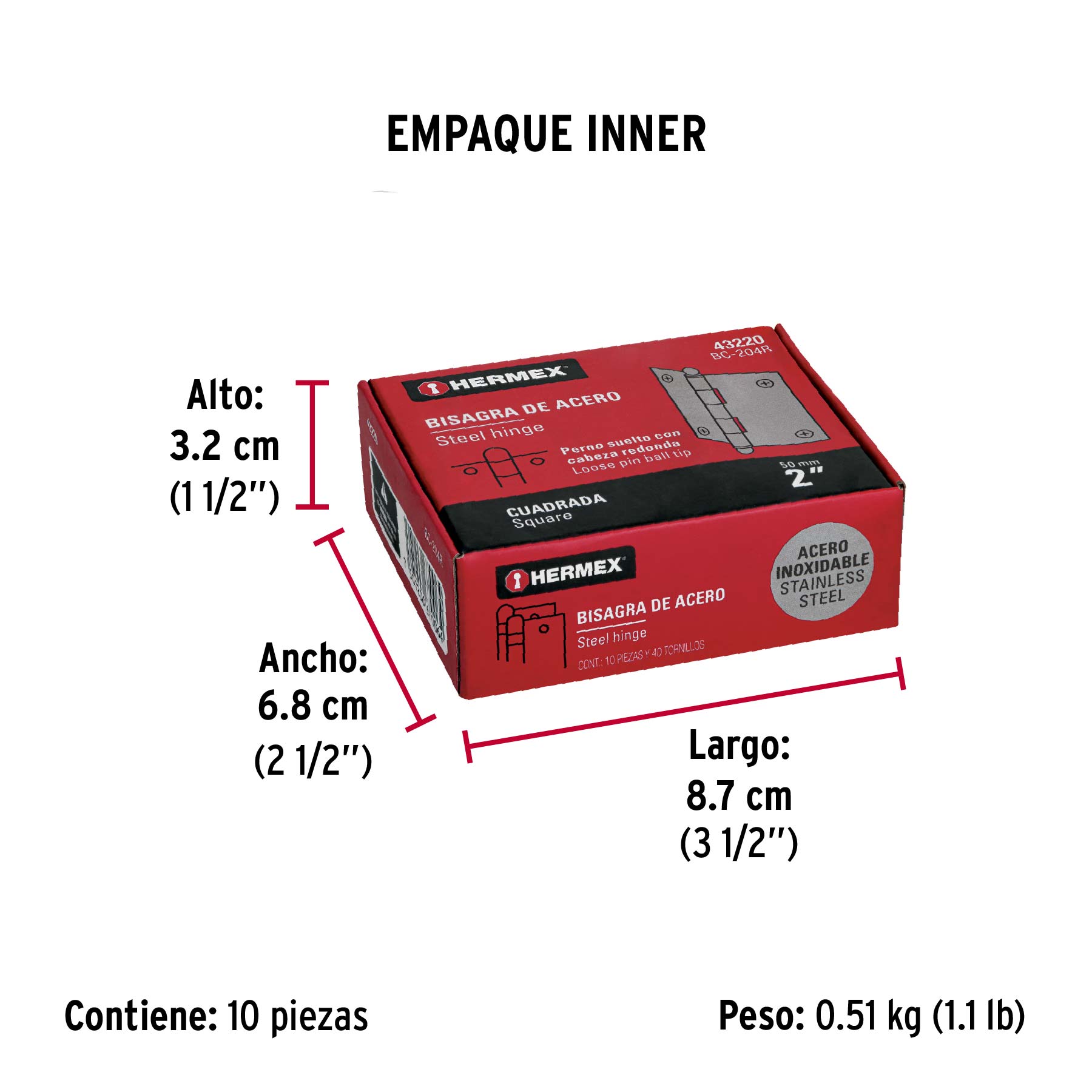 Bisagra cuadrada 2" acero inox, cabeza redonda, HERMEX