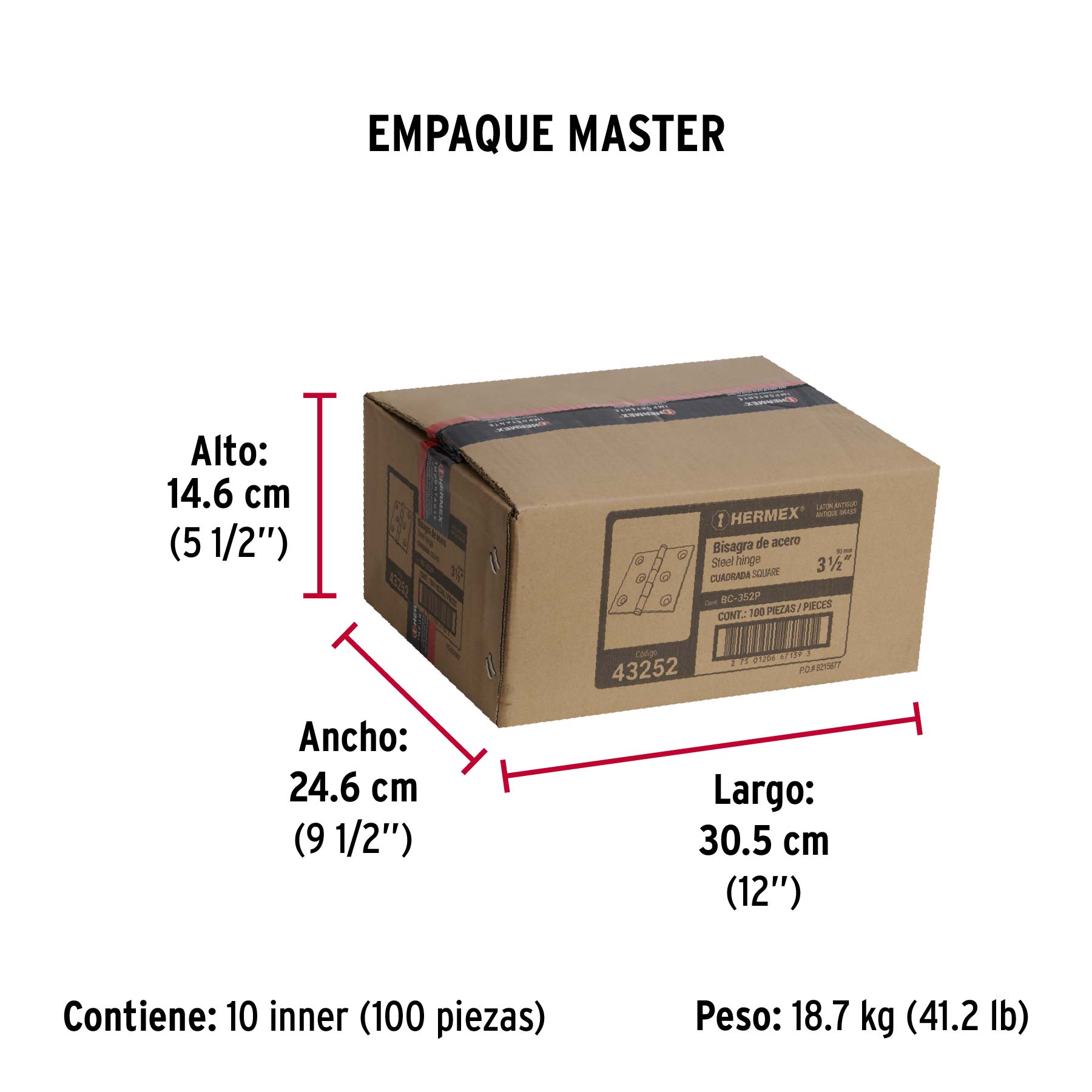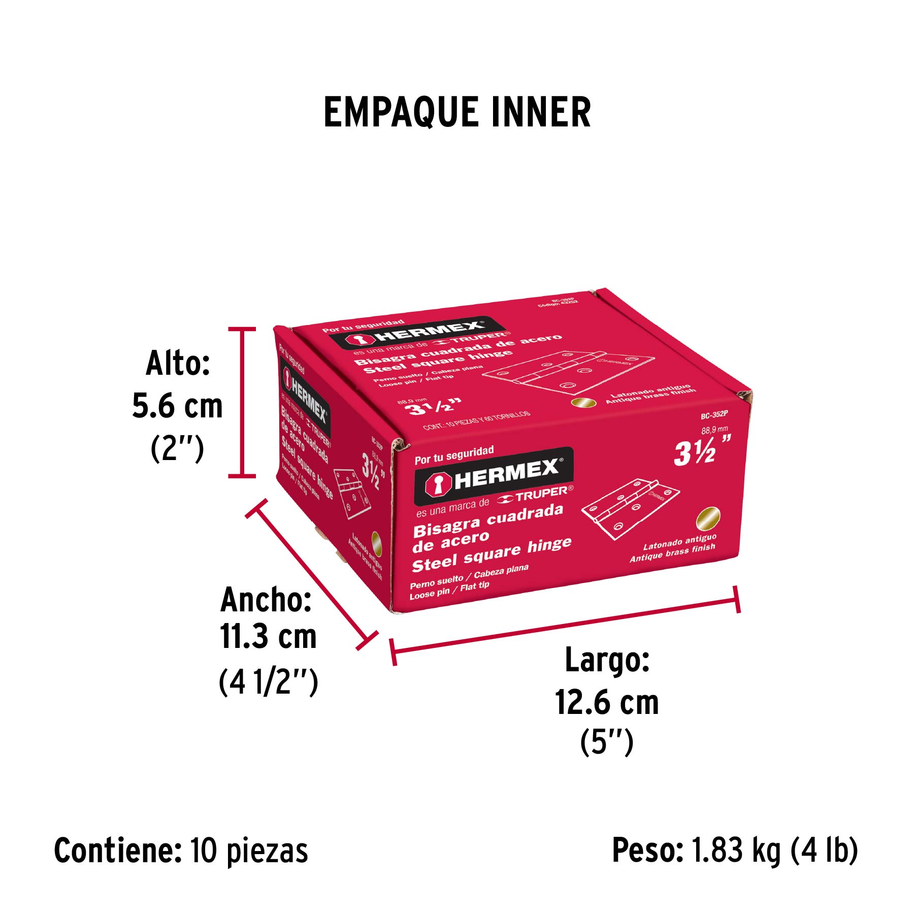 Bisagra cuadrada 3-1/2", latón antiguo, cabeza plana, HERMEX