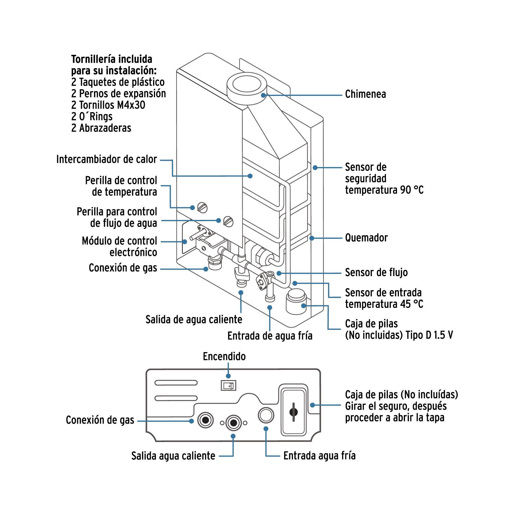 Se enciende automáticamente al detectar demanda de agua caliente, utiliza 2 pilas D (no incluidas)
