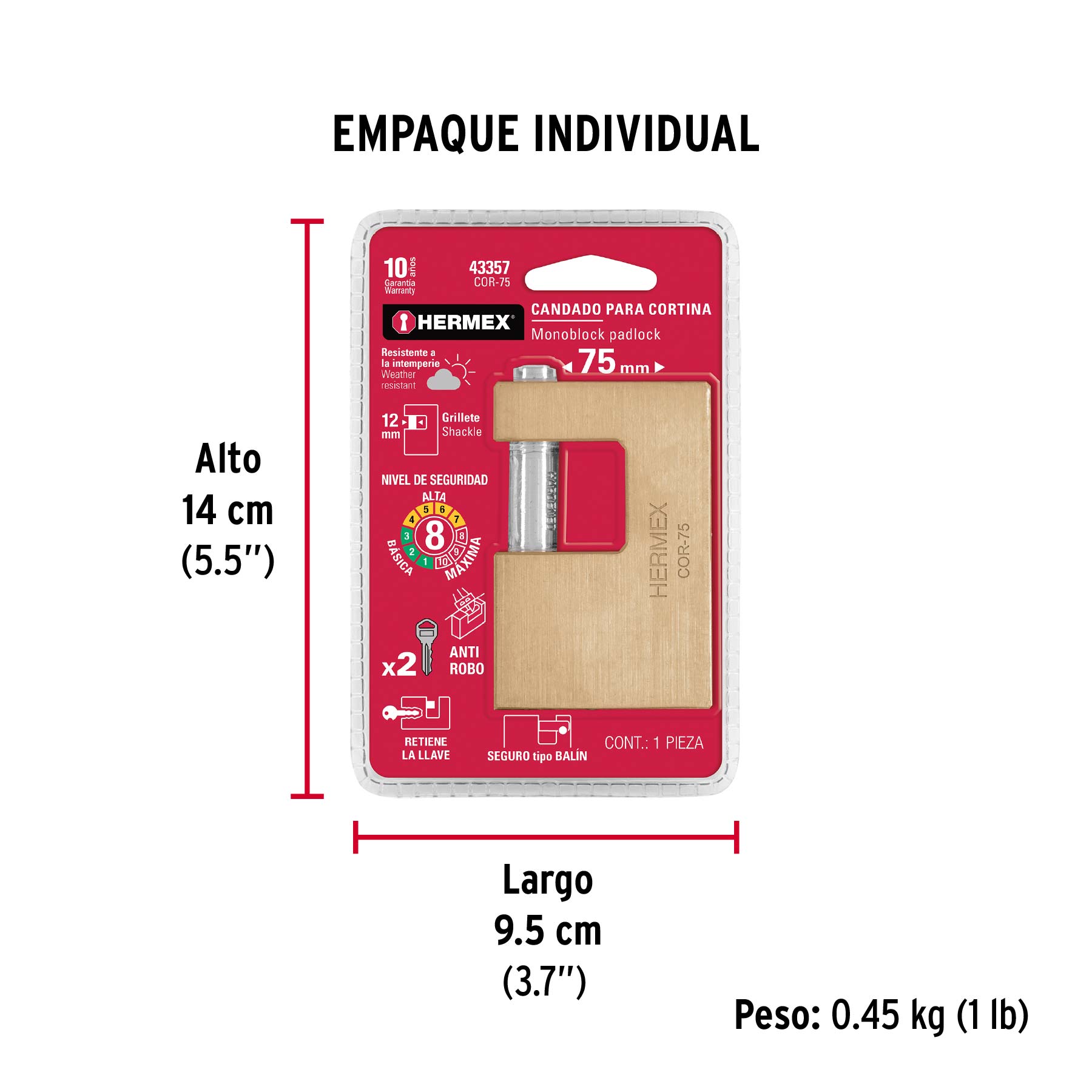 Candado antipalanca, 75mm, cuerpo de latón llave tradicional